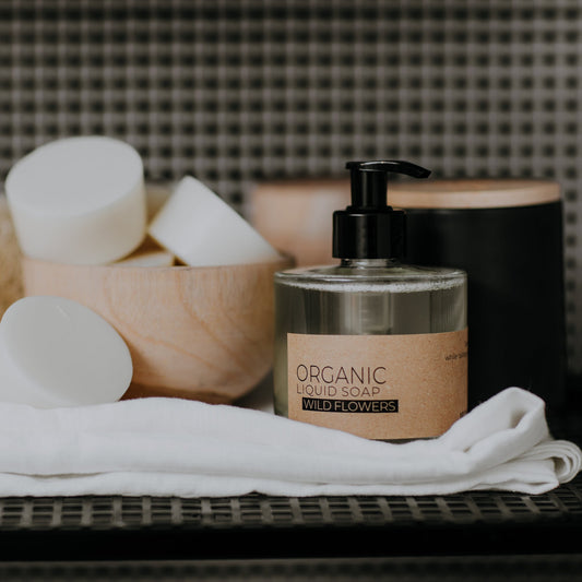 Wild flowers organic liquid soap in glass bottle