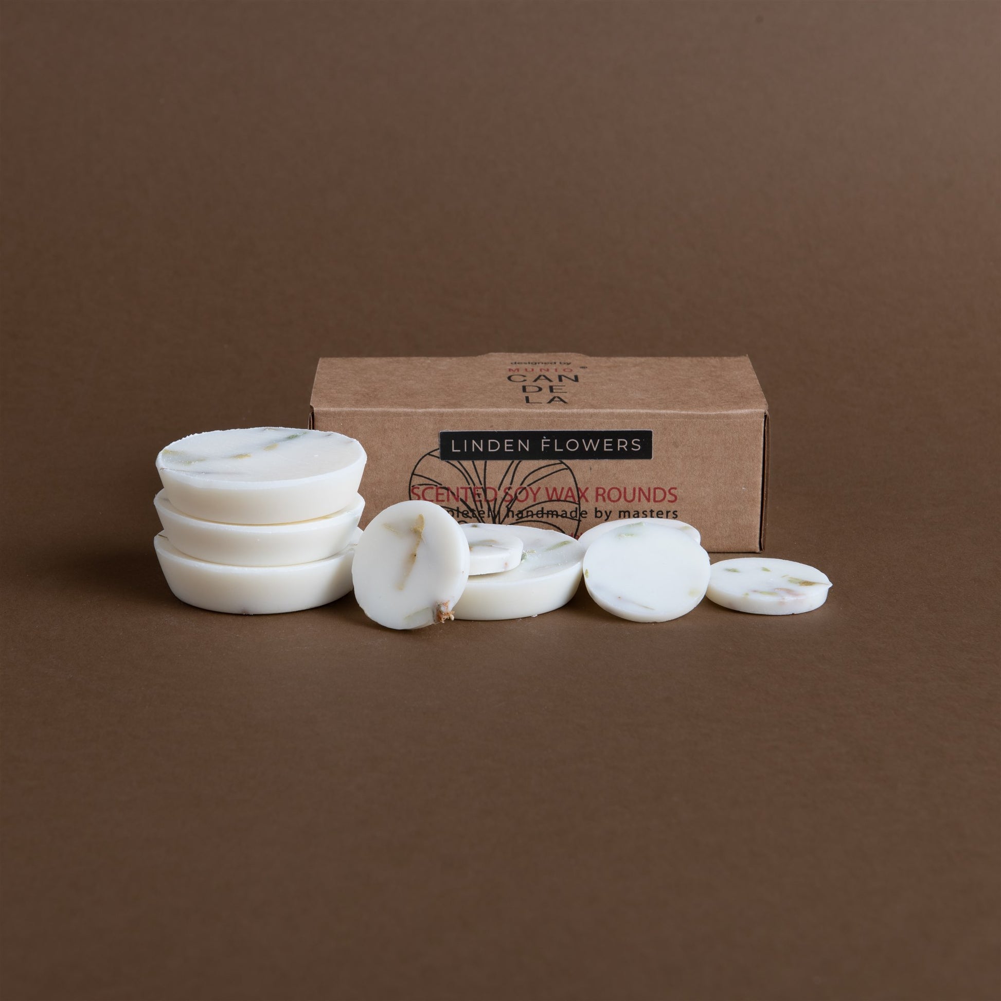 Handcrafted from a sustainable blend of soy and rapeseed wax, these scented wax rounds are infused with delicate linden flowers fragrance and decorated with linden flowers. Perfect for scenting drawers, closets, or small spaces, they can also be used in wax warmers for a more intensive aromatic experience.